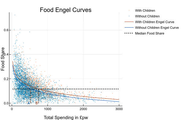 Now we can calculate an empirical equivalence scale. Pick some share of food spending - a good one might be the median food share (11.6%). That’s the dashed horizontal line. Then we look up on the Engel curves the level of total spending the two groups would on average need for this share. These are the points A and B on the diagram - for households with children, this is £747.90 (point B) and for those without, it’s £525.38 (A). The ratio between these is 1.423, which is our simple equivalence scale: our estimate is that families with children need 42% more spending than families without to enjoy the same standard of living.