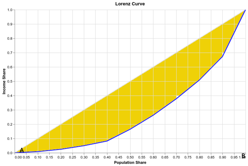 The bigger the yellow area the greater the inequality. The Gini Coefficient just expresses this area as a percentage2 of the triangle ABC in the diagram. Complete inequality gives a Gini of 1, and complete equality gives 0.